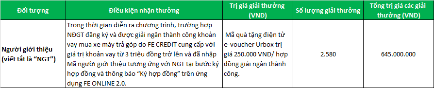 - Người được giới thiệu (sau đây viết tắt là “NĐGT”): là khách hàng đăng ký và có hợp đồng vay mua xe máy trả góp từ 3 triệu đồng trở lên được duyệt trên ứng dụng FE ONLINE 2.0 và có nhập Mã người giới thiệu vào màn hình thông báo Ký hợp đồng vay mua xe trả góp do FE CREDIT cung cấp thành công trên ứng dụng.