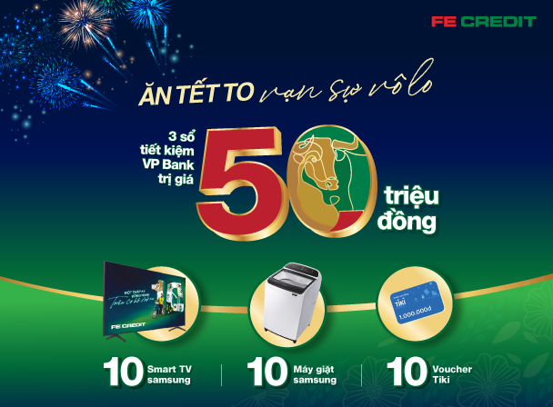 Nhân dịp năm mới 2021, với mong muốn mang đến cho khách hàng một khởi đầu thuận lợi, vơi bớt lo toan, đón một cái Tết thực sự đủ đầy, FE CREDIT chính thức triển khai chương trình khuyến mãi lớn Ăn Tết To - Vạn Sự Vô Lo, với tổng giá trị giải thưởng hơn 300 triệu đồng dành cho khách hàng trên toàn quốc.