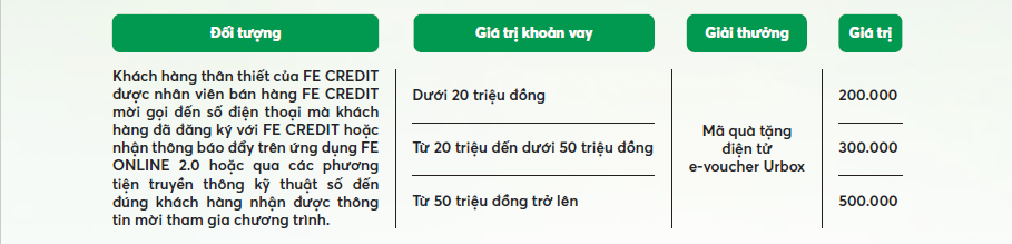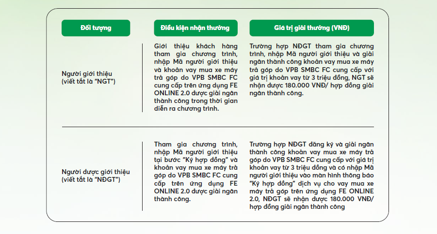 • Thể lệ chương trình: Khách hàng có tài khoản trên ứng dụng FE ONLINE 2.0 giới thiệu khách hàng khác đăng ký mua xe máy trả góp do FE CREDIT cung cấp sẽ nhận được quà tặng theo chương trình.