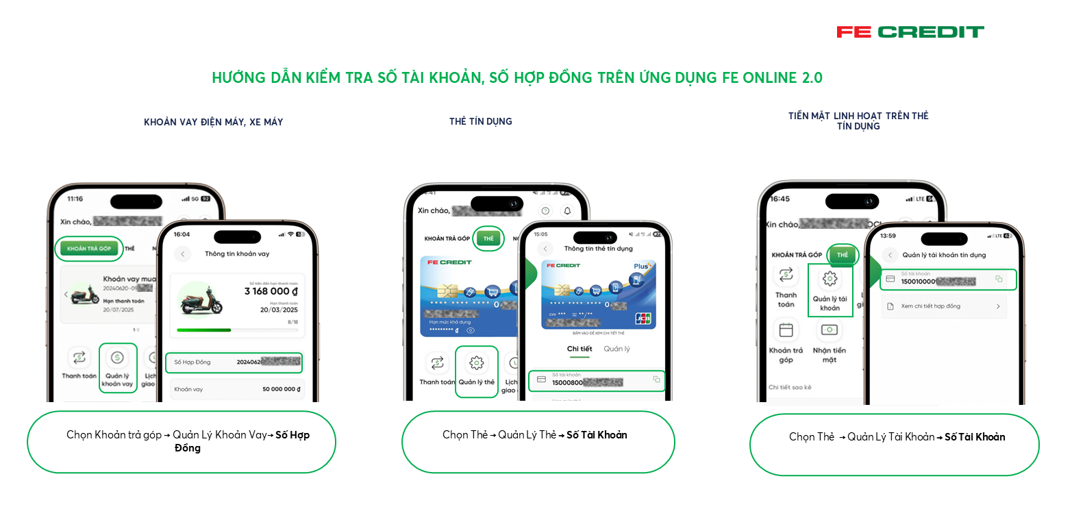 Mỗi khoản vay hoặc thẻ tín dụng tại FE CREDIT được cấp một mã số riêng, gọi là số hợp đồng (cho khoản vay điện máy, xe máy) hoặc số tài khoản thẻ (cho thẻ tín dụng, Tiền mặt linh hoạt trên thẻ). Khi thanh toán bằng chuyển khoản, việc nhập sai hoặc thiếu mã số này có thể khiến giao dịch bị treo và phát sinh nhiều vấn đề cần xử lý, khắc phục. Vì vậy, Quý Khách hàng cần kiểm tra kỹ thông tin trước khi thực hiện: