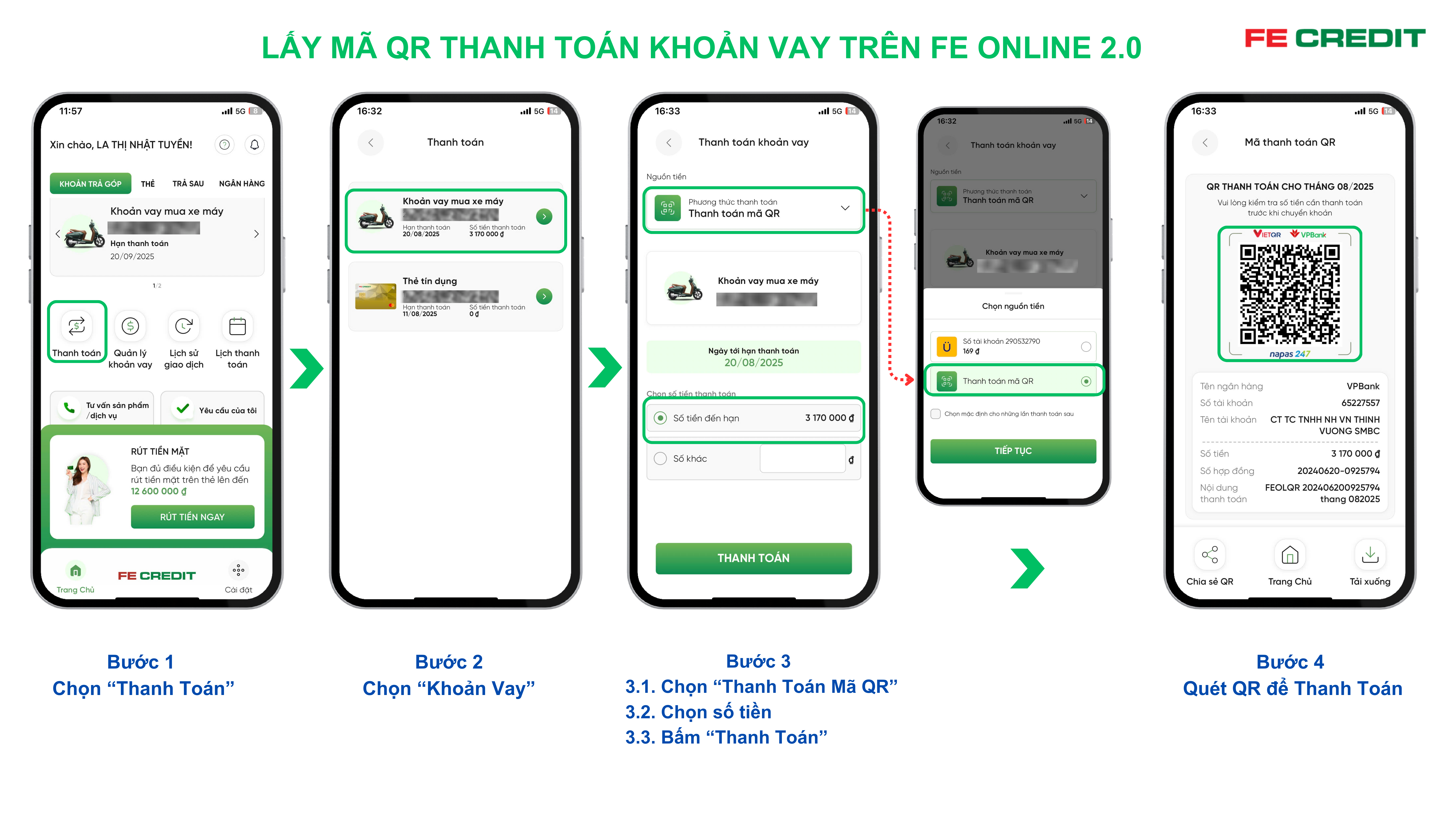 Trong quá trình thanh toán nếu cần hỗ trợ thêm, Quý Khách hàng vui lòng liên hệ các kênh chính thức của Trung tâm Dịch vụ Khách hàng FE CREDIT để được tư vấn và xử lý kịp thời.