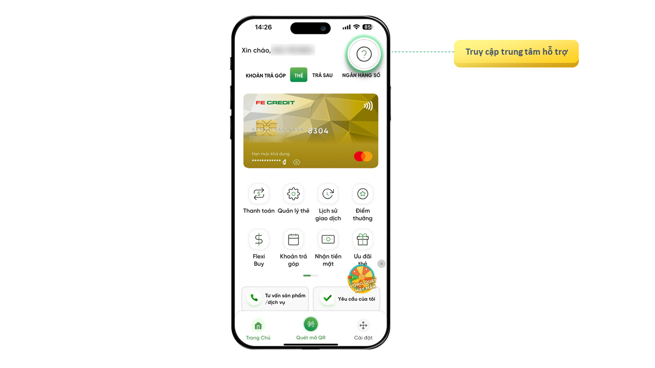 Quý Khách hàng có thể truy cập tính năng “Trung Tâm Hỗ Trợ” ngay trên trang chủ ứng dụng FE ONLINE 2.0, qua đó dễ dàng quản lý khoản vay, thẻ tín dụng, tra cứu thông tin và nhận hỗ trợ kịp thời, nhanh chóng.
