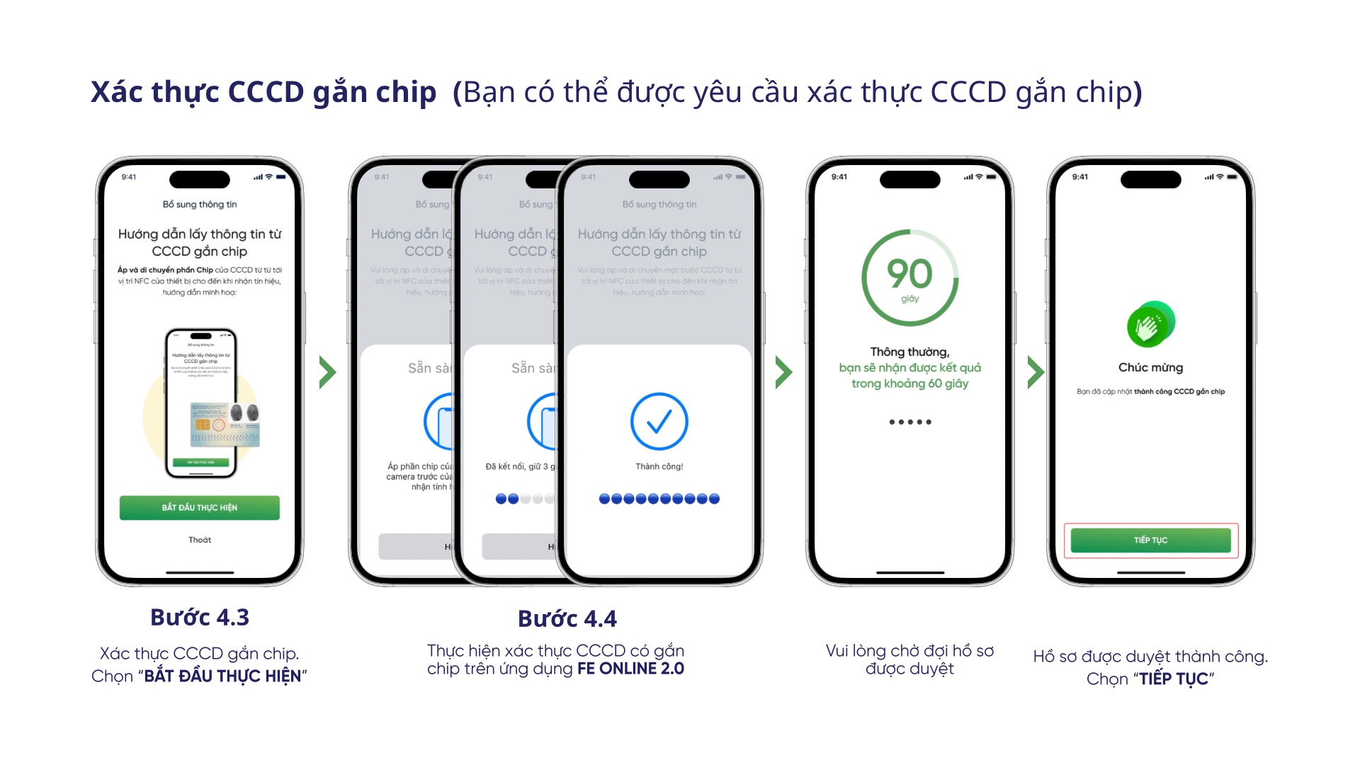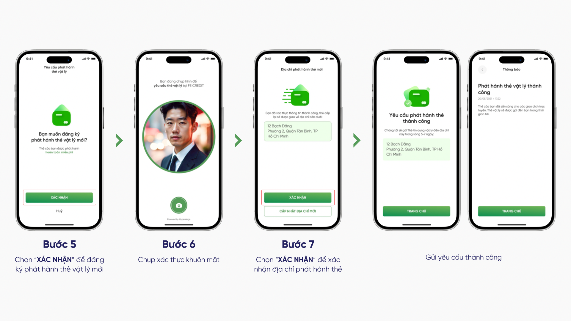 Đối với thẻ tín dụng đã hết hạn, khách hàng vẫn có thể sử dụng tính năng “Yêu cầu thay thế thẻ vật lý” trên FE ONLINE 2.0 để tiếp tục sử dụng dịch vụ. Trước khi thực hiện đến bước 5, khách hàng cần thực hiện xác thực sinh trắc học theo hướng dẫn bên dưới. Sau đó, khách hàng tiếp tục các bước còn lại để hoàn thành quy trình. Sau khi gửi yêu cầu thay thế, thẻ sẽ được gia hạn và có thể sử dụng từ ngày hôm sau.