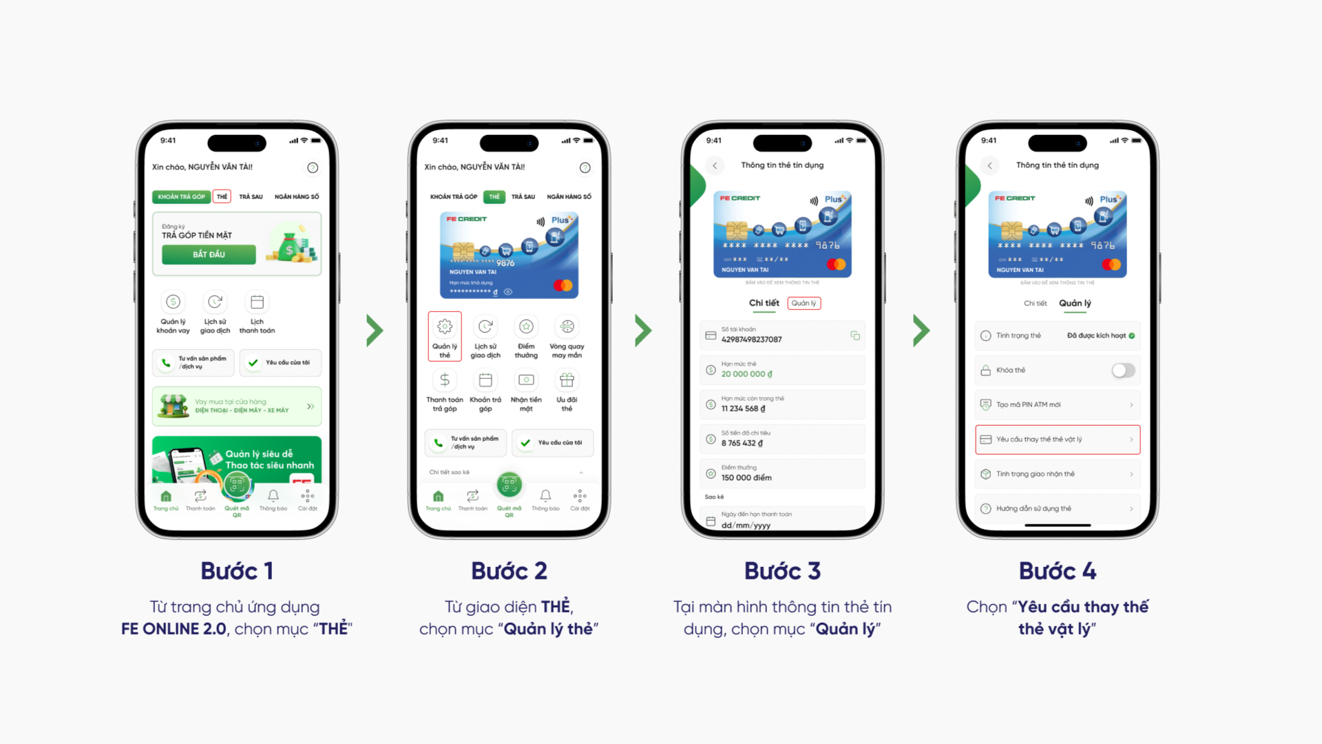 Tính năng “Yêu cầu thay thế thẻ vật lý” giúp khách hàng chủ động gửi yêu cầu mọi lúc, mọi nơi mà không cần liên hệ tổng đài. Chỉ với vài thao tác đơn giản trên ứng dụng FE ONLINE 2.0, yêu cầu sẽ được xử lý nhanh chóng và bảo mật, mang đến trải nghiệm linh hoạt và an tâm.
