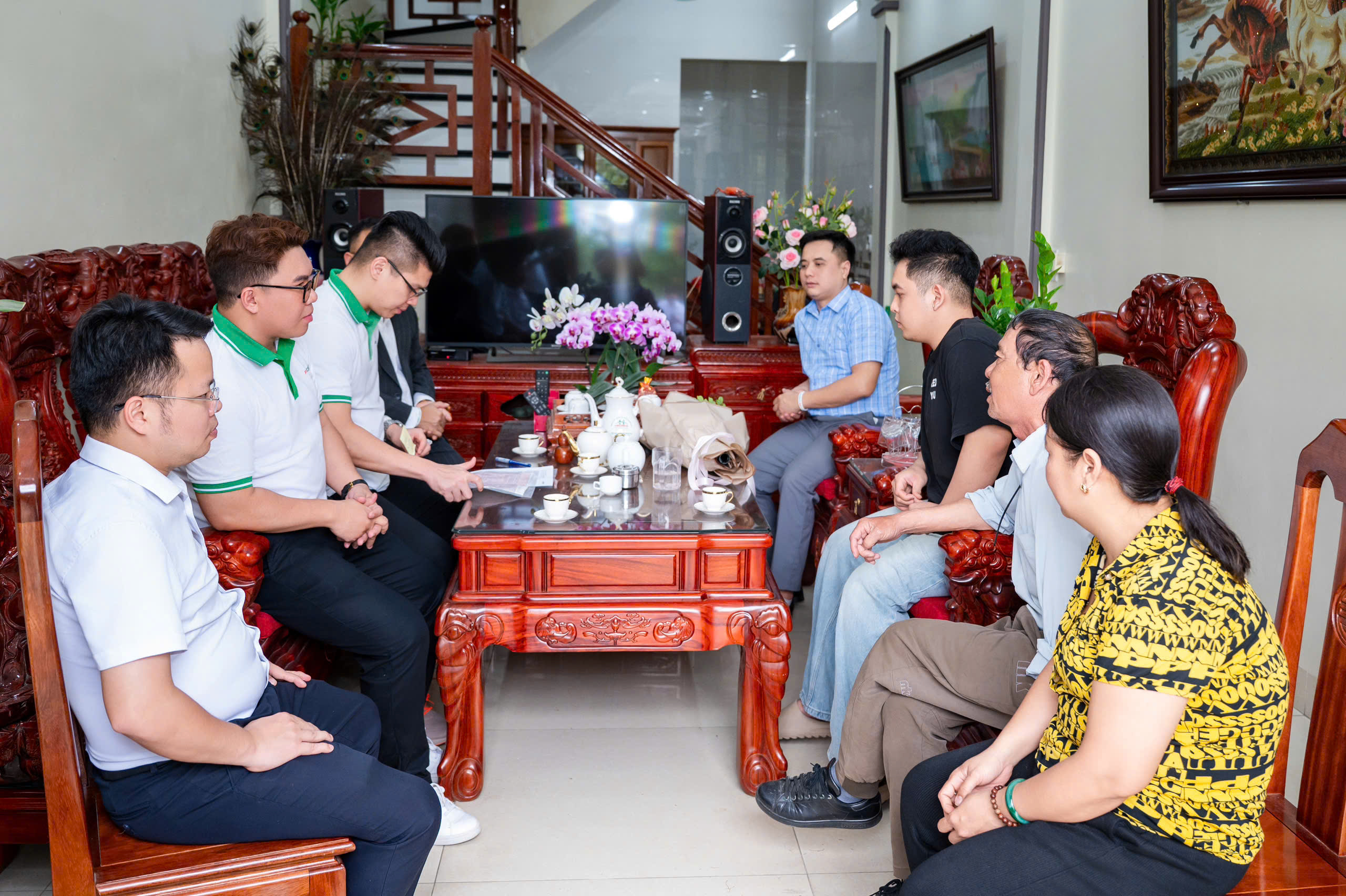 Gia đình anh Nguyễn Thanh Hưng (áo đen) đón tiếp và trò chuyện cùng đại diện FE CREDIT. Ảnh FE CREDIT.
